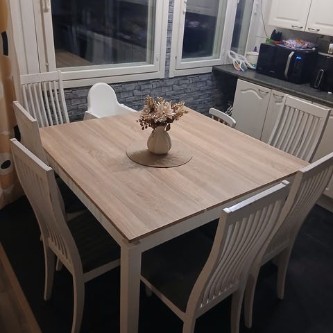 Annetaan neljä keittiön tuolia vaikkapa mökkituoleiksi tai uudelleen verhoiltaviksi. Rungot ehjät mutta nahkaverhoilut kärsineet.