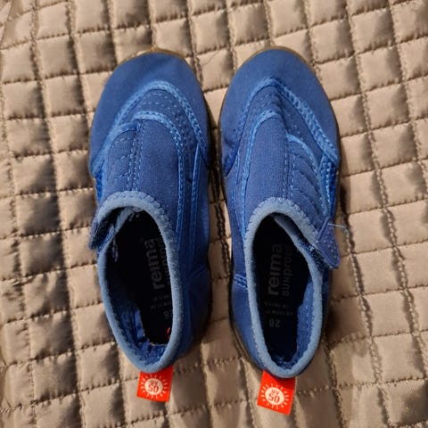 Tummansiniset Reima Lean uimakengät, koko 28. Suositeltu jalan pituus Reiman sivujen mukaan 16,9-17,4 cm. UV-suoja SPF 50. Sopii niin rannalle, jumpalle kuin kesällä ihan arkikäyttöönkin. Joustava taipuisa pohja.