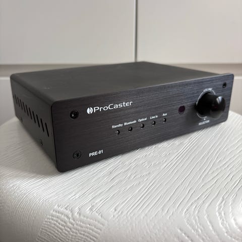 Kun haluat liittää aktiivikaiuttimiin muutakin kuin television, niin ProCaster PRE-01 tuo sinulle riittävästi liitäntöjä. Vahvistimessa on pieni koko, mikä mahdollistaa helpon sijoittamisen kaapistoon ja siinä on kattava valikoima liittimiä. Optisen liittimen ansiosta saat television helposti kiinni vahvistimeen, vaikka siitä uupuisikin analoginen lähtö. RCA-liittimiin kiinnität vaikka levysoittimen tai Googlen Chromecast audio-streamerin. Kaukosäätimellä ohjaat huoletta kauempaakin ja laite osaa myös käskyttää Bluetoothin lähdettä. Metallinen äänenvoimakkuuden säätö on digitaalinen ja sopivasti pykälöity.