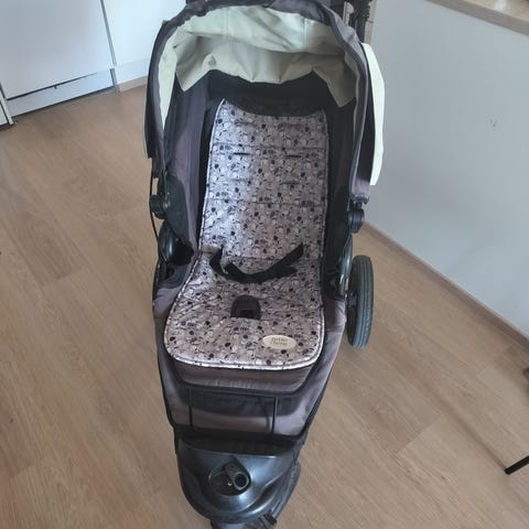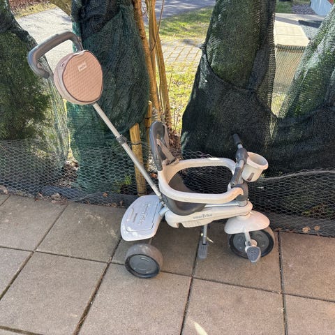 kolmipyörä rattaiden työntöaisalla ja aurinkosuojalla. Kolmipyörässä on istuin selkänojalla ja turvakaarella, polkimet etupyörässä sekä työntöaisa aikuiselle. Yläpuolella on kangaskatto aurinkosuojaksi. Takana on säilytyskori pientä tavaraa varten. Soveltuu pienelle lapselle ulkoiluun ja liikkumisen harjoitteluun aikuisen valvonnassa.