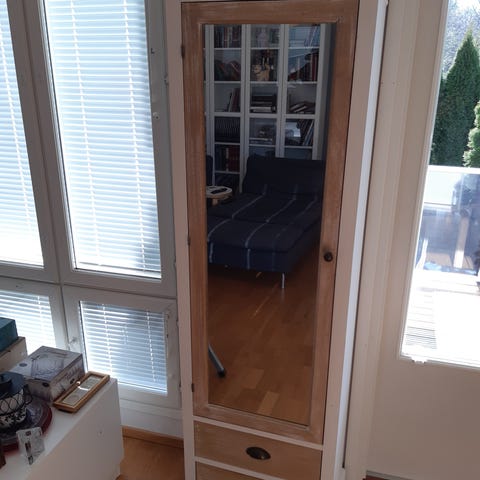 Puinen peilikaappi hyllyillä ja laatikoilla ja erilaisilla vetimillä