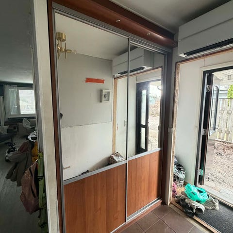 Peilit myös ovien sisäpinnalla. Sisällä valkoisia hyllylevyjä.
