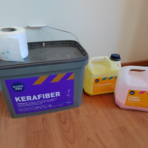 Kiilto Pro Kerafiber vedeneriste 5 litraa jäljellä 15 litran ämpärissä. Kuituvahvistettu, pastamainen vedeneristysmassa esimerkiksi märkätilojen lattioiden ja seinien vedeneristämiseen ennen laatoitusta. Väri turkoosi/sininen. Soveltuu käytettäväksi valmistajan ohjeiden mukaan yhteensopivien pohjamateriaalien ja laattaliimojen kanssa.