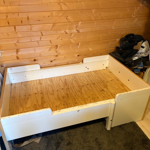 Niemi Designin Unipuu Jatkopuu juniorsänky, kunto kohtalainen johtuen halkeamasta rungossa, ks. kuva 2. Edelleen erittäin tukeva, ei vaikuta käyttöön etenkään jos lyhyenä. Käytön jälkiä. Putoamista estävä laita kiinnitetty ulkosivuun.