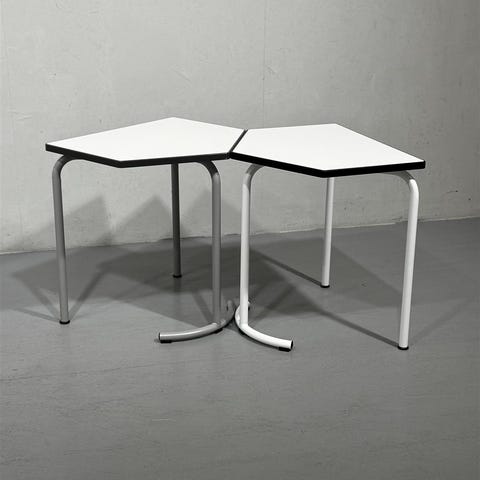 Kaksi valkoista Iskun valmistamaa Summa GA pöytää, joissa on tummat reunat ja metallijalat. Pöydät ovat muotoiltu siten, että ne voidaan yhdistää toisiinsa tai käyttää erikseen, eri tavoin. Pöydät edustavat modernia muotoilua, joka on käytännöllinen ja monipuolinen. Isku on tunnettu suomalainen huonekalujen valmistaja, joka on perustettu vuonna 1928 ja on erikoistunut laadukkaisiin kalusteisiin.