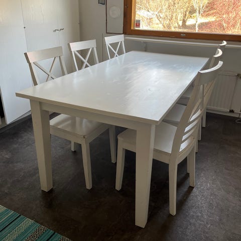 Pohjanmaan kalusteen 6hlö ruokailuryhmä. Tuolit siistit ja hyväkuntoiset. Pöytälevyssä jonkun verran naarmuja(näkyy kuvissa), pinnan voi hioa ja öljytä uusiksi.
