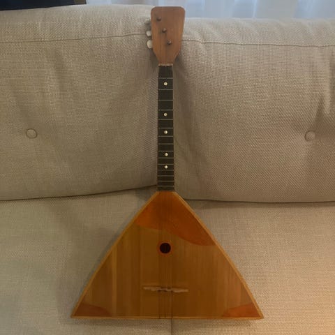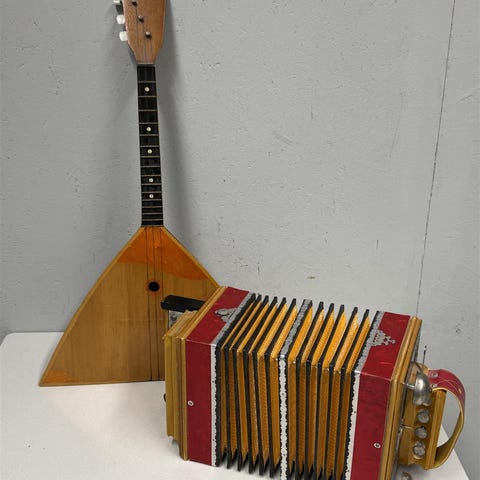 Balalaikka, jossa on kolmikulmainen runko ja kolme kieltä. Harmonikka, jossa on punainen ja keltainen väritys sekä koristeelliset yksityiskohdat.