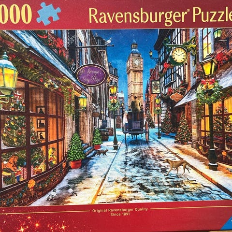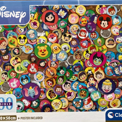 Ravensburger Disney palapeli, jossa on 1000 palaa. Kuvassa on Disney-hahmoja ja -leluja täynnä oleva huone.