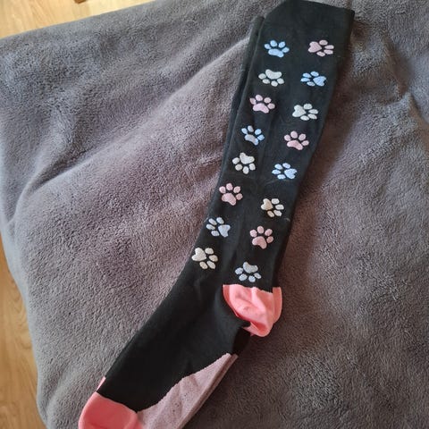 Polvipituiset mustat tukisukat, koko 38-39, varren pituus kantapään alta ylös 36 cm, kuin uudet, kohtalaisen tiukat