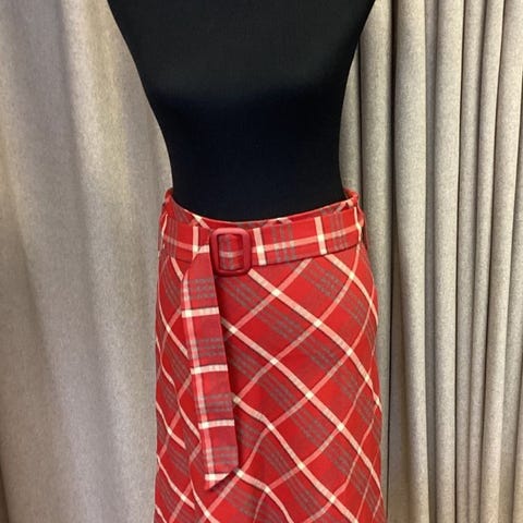 H&M ruudullinen hame kokoa 38. Beige, musta, punainen ja valkoinen. Sivulla vetoketju ja neppari. Materiaalit pääasiassa polyesteri ja viskoosi.