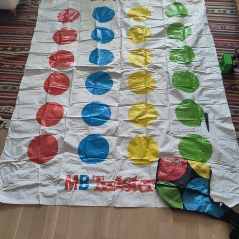 MB Twister lautapeli. Peli sisältää värillisen pelimaton, pyörivän osoittimen ja ohjeet. Tarkoitettu vähintään kahdelle pelaajalle. Ikäsuositus 6 vuotta ja vanhemmat. Peliä pelataan asettamalla kädet ja jalat pyörän osoittamille värillisille ympyröille pelimatolla.