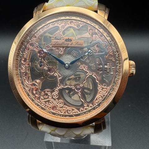 Lindberg&Sons Thorias THC No.1 täysi skeletointu käsinvedetty kell.- ruostumattomasta teräksestä valmistettu kotelo ip rosegold- manuaalivetoinen koneisto- täysi skeletointu kellotaulu- kotelon halkaisija noin 43 mm ilman kruunua- rajoitettu erä- vedenkestävyys 5 ATM- nahkaranneke ruostumattomasta teräksestä valmistetulla nastasoljellakello on käyttämätön.erinomaisessa kunnossa, käyttämätönvalokuvat ovat osa kuvaustavakuutettu toimitus sisältyy