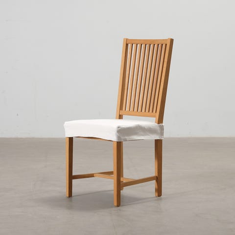 Fogian valmistama laadukas ja ajaton ruokapöydän tuoli puisella rungolla valkoisella kangasverhoilulla.