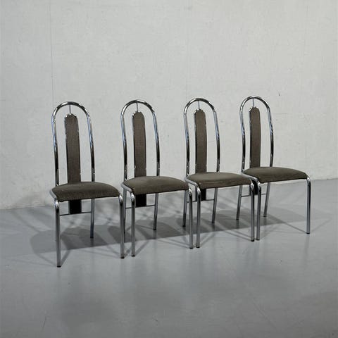 Neljä retrotyylistä Italialaista kromirunkoista tuolia, joissa on metallinen runko ja samettinen kangasverhoilu. Tuolit ovat ok kunnossa, rungot hyvät mutta verhoilut kuluneet ja niissä on kaarevat selkänojat.