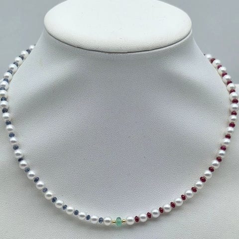 Kaulakoru - 18 kt. Keltakulta Helmi - Safiiri - Rubini/smaragdi