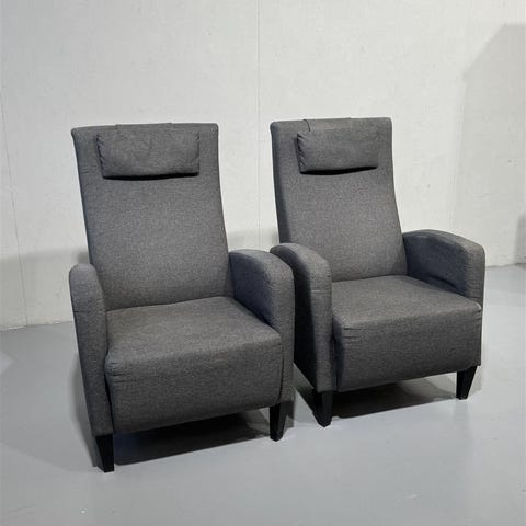 Kaksi modernia nojatuolia, joissa on korkea selkänoja ja pehmustetut istuimet. Tuolit ovat harmaita ja niissä on mustat jalat. Niskatuet mukana, irralliset.