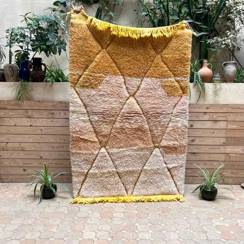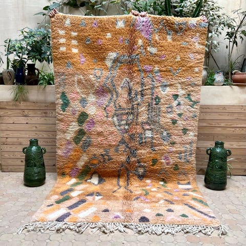 Ihastuttava marokkolainen käsinsolmittu matto. Matto on käyttämätön ja juuri pesty valmistuksen jälkeen. Tämän kun kerran lattialle asettaa, on siitä vaikea luopua. Boujaad on perinteinen berberien matonkutomisalue Marokossa. Perinteisten kuvioiden lisäksi sieltä tulee tänäpäivänä upeita moderneja mattoja, jotka ovat ainutlaatuisia värienkäytön ja käsityön taidonnäytteitä.