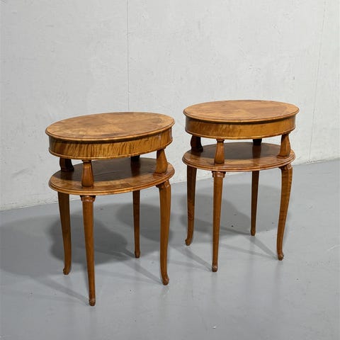 Kaksi klassista ovaalin muotoista sohvapöytää, joissa on koristeelliset jalat. Pöydät ovat kaksitasoisia, mikä tarjoaa lisää säilytystilaa.