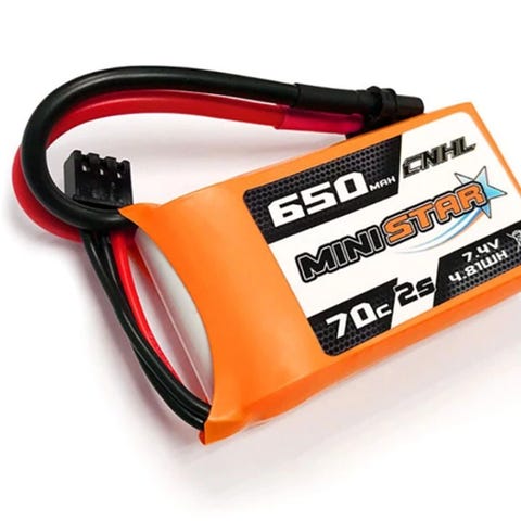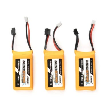 The CNHL MiniStar Battery set consists of three lithium polymer (LiPo) batteries, each with a capacity of 350mAh and a voltage of 7.4V. These batteries boast a high discharge rate of 70C, ensuring reliable power delivery for demanding applications. They have BT2.0 connectors and are suitable for use in small RC models or drones requiring stable and efficient power output.