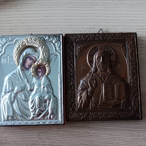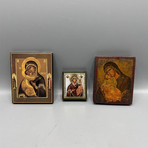 Kolme erilaista ikonia, joissa kaikissa on kuvattuna Neitsyt Maria ja Jeesus-lapsi. Ensimmäinen ikoni on tummasävyinen ja siinä on kultaisia yksityiskohtia. Toinen ikoni on koristeltu vihreällä ja hopeisella kehyksellä. Kolmas ikoni on vanhemman näköinen, ja siinä on kulumaa.