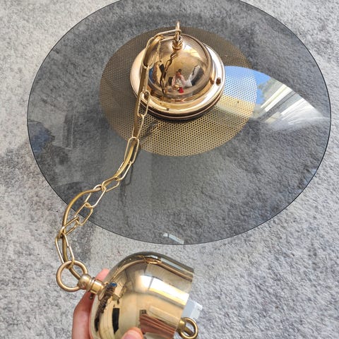 Vintage Sievä Oy kattovalaisin. Kolme valopistettä opaalilasi varjostimilla, patinoitunut messinkinen runko.