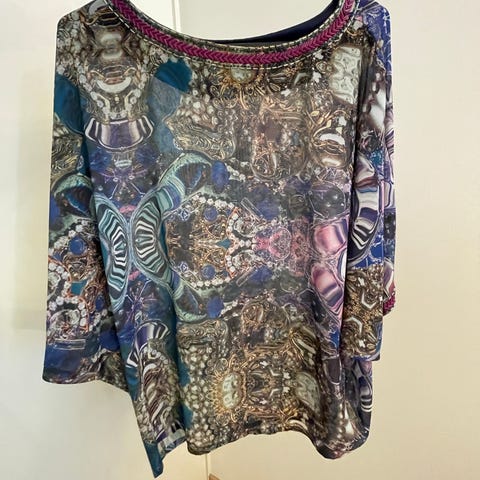 Vaaleansininen kukkakuosinen Ted Baker toppi / t-paita kokoa 4, vastaa M/L. Joustavaa viskoosi-elastaania, olka-helma noin 66cm, kai-kai joustaa noin 47-70cm. Hyvä, moitteeton kunto.