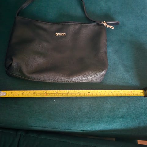 Guess tekonahkainen unisex laukku musta. Laukku on suurehko shopper-tyyppinen malli, jossa on pitkät kantohihnat olalla kantamista varten. Materiaalina on musta tekonahka ja etupuolella on Guess-logo. Laukun sisäosa on vaalea ja siinä on useita lokeroita pientavaroille. Ulkopuolella on vetoketjutasku. Kuvat näyttävät mitat pituuden ja korkeuden osalta, mikä helpottaa koon arviointia esimerkiksi arki- tai työkäyttöön. Sopii käytettäväksi sekä naisille että miehille.
