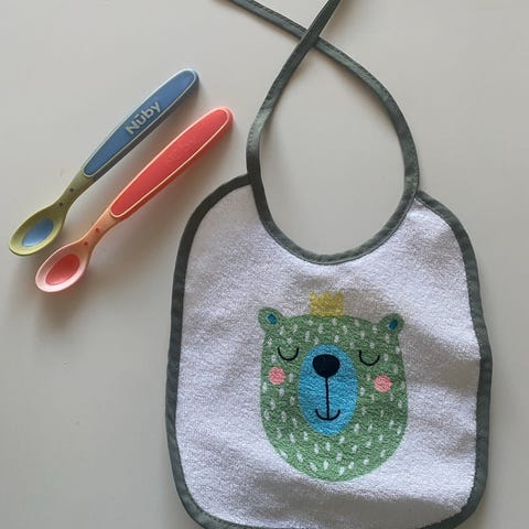 Myydään vauvan ruokailuun välineitä. Ruokalappu kovamuovinen jossa säätömahdollisuus. Nūby merkin ensilusikat, näissä värjäymää soseista muuten ehjiä kaikki. Smoothiepussiin laitetta korkki. Kaikki ehjiä.