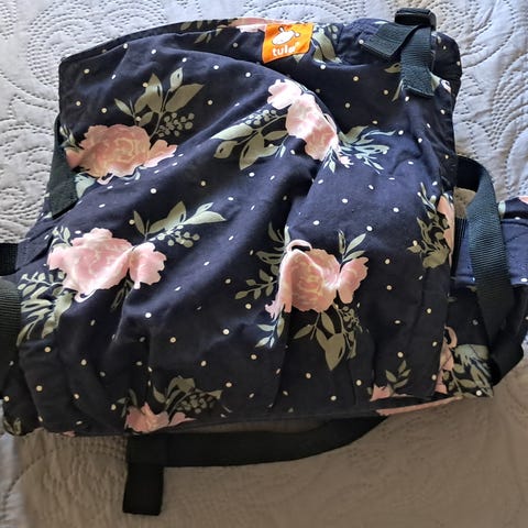 Tula kantoreppu kukkakuvioisella tummansinisellä blossom-kankaalla. Repussa on säädettävät olka- ja vyötäröhihnat sekä soljet istuvuuden säätöön. Sopii vauvan tai taaperon kantamiseen edessä tai selässä. Mukana vauvan päätuki (huppu), alkuperäinen laatikko ja ohjeet.