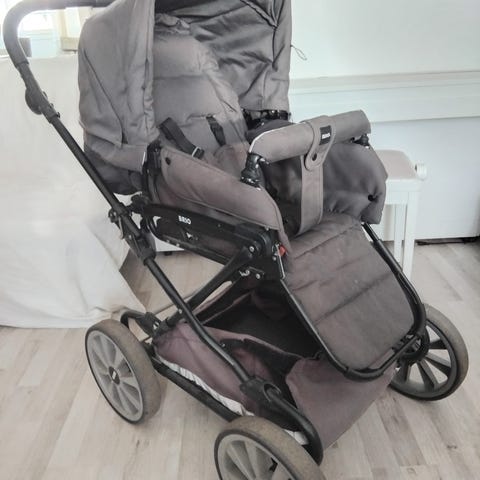 Brion tumman siniset vaunut. Mukaan vauvalle vaunupussi ja ratasosa. Hyvät renkaat, ei puhkeile. Iso tavara kori. Mukaan hyttysverkko.
