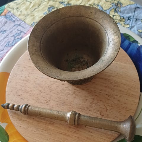 Myydään kaunis messinkinen mortteli, kork. 9, halk.7 cm.