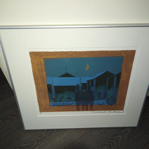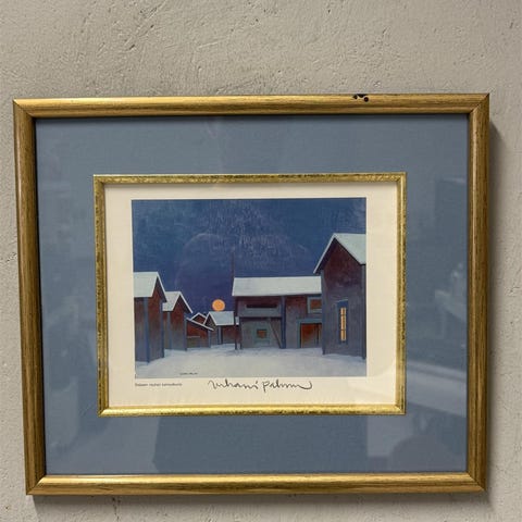 Taulu printti, jonka nimi on 'Sisäisen rauhan tunnuskuvia', signeerattu Juhani Palmu. Kuvassa on talvinen maisema, jossa näkyy useita rakennuksia ja täysikuu taustalla.