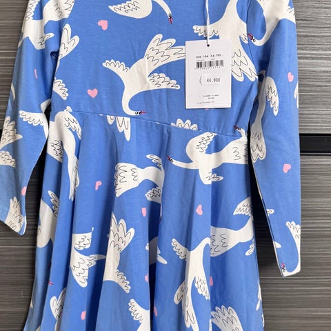 Myydään Polarn O. Pyret mekko. Koko 104. Väri tummansininen,valkipilkullinen. Edessä kaksi kaunista joutsenen muotoista taskua.