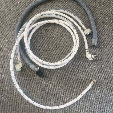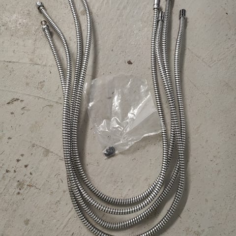 Metallipäällysteiset suihkuletkut. Letkuissa on liittimet molemmissa päissä ja yksi sininen muovipintainen letku. Sopivat esimerkiksi suihkuun tai muihin vesikalusteisiin, joissa käytetään vastaavanlaisia letkuja ja liittimiä.