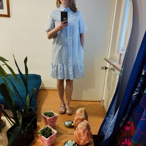 Gauhar Helsinki kesämekko naisille. Koko XS/S. Materiaali puuvillaa. Mekossa on sininen, hillitty ruutukuosi, pyöreä kaulus ja nappikiinnitys edessä. Vyötäröllä on kevyt rypytys, joka antaa väljyyttä helmaan. Hihat ovat noin 3/4-pituiset. Sopii arkikäyttöön ja kesäisiin menoihin.
