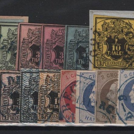 Altdeutschland Braunschweig, 1853/63, Partie, Michel-Nr. 6, 7 & 10 A - 12 A, leimattu ja 1× käyttämätön, kaksi merkkiä voimakkaalla taitoksella, osittain signeerattu, Michel-katalogiarvo 550 €