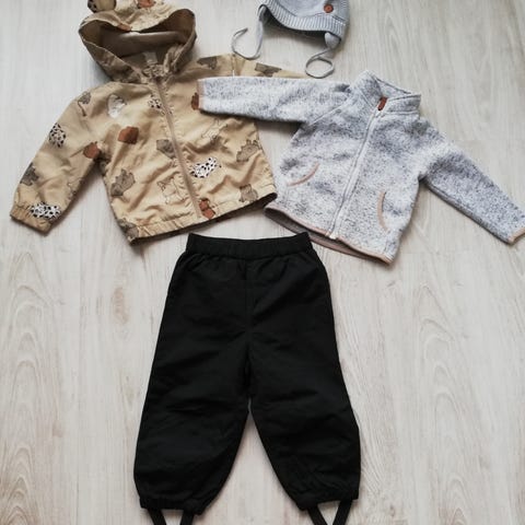Sininen windfleece ja tummansiniset kuorihousut. Windfleece hyvässä/siistissä kunnossa, pinta ei ole uudenveroinen.