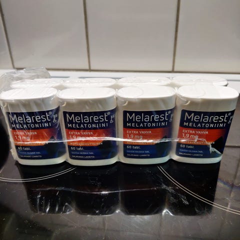 Avaamaton purkki pitkävaikutteista melatoniinia, ravintolisätabletti, jonka vahvuus on 1,9 mg per tabletti