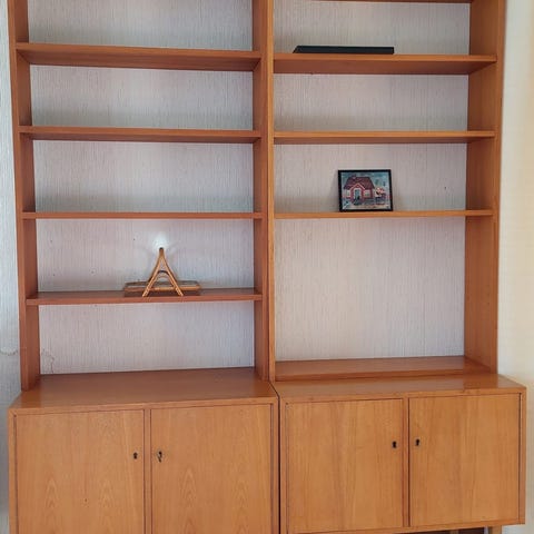 Myydään hyväkuntoiset 60-luvun kirjahyllyt, joista toisessa lasivitriini ja molemmissa ovelliset alakaapit.