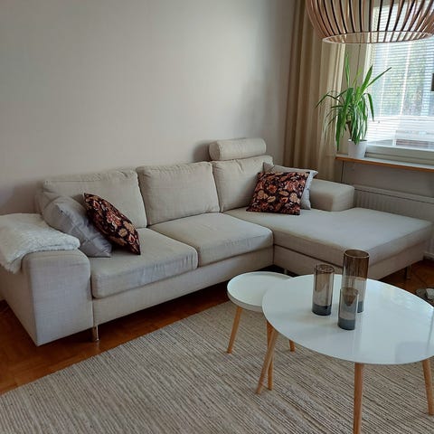 Leveys 217. Divaani 149cm. Kätisyys vaihdettavissa ja päälliset voi irrottaa ja pestä pesukoneessa. Kuljetus mahdollisuus pk-seudulle