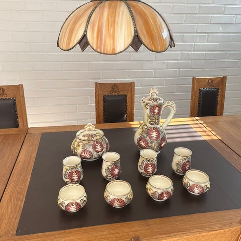 Bulgarian Troyan keramiikka kahviastiasto. 6 kuppia + lautaset + kahvikannu kannella + maitokannu + sokeriastia kannella.