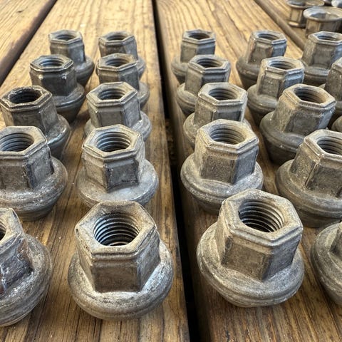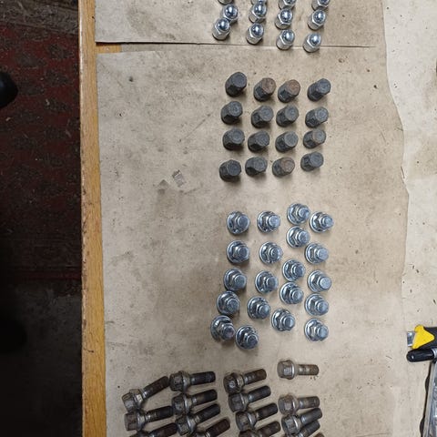 20 kpl alumiini- tai peltivanteille sopivia teräsmuttereita. M12 x 1,5 . Pituus 31mm. Sopii mm. Ford ja Volvo. Ei todellakaan biltema laatua. (Motonetissä 3,99 kpl).
