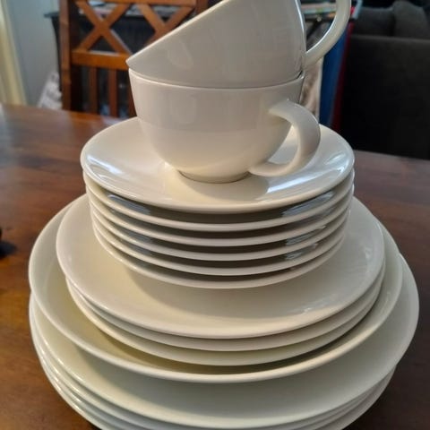 Arabia 24h kahvikupit ja lautaset (halkaisija 17 cm) valkoista posliinia. Settiin kuuluu kaksi kahvikuppia ja kaksi aluslautasta. Sopivat arki- ja kattausastioiksi esimerkiksi kahville, teelle tai muille kuumille juomille. Sarja on suunniteltu päivittäiseen käyttöön keittiön perusastioiksi.