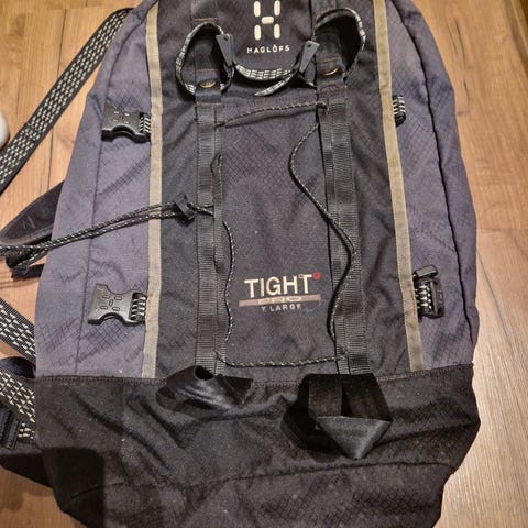 Siistikuntoinen iso Haglöfs Tight -reppu. Tämä on muutaman lentomatkan tehnyt ruumassa ja käynyt muuallakin, mistä on jäänyt jonkin verran elämän jälkiä. Toinen sivuremmin kiinnitysklipsi on jäänyt jonnekin matkan varrelle eli puuttuu, ja toiselta puolelta sivuremmi on alkanut purkautua päästä, mutta kiinnitysommel on vielä kaukana ja ehjä. Kannessa logon lähellä on pari pientä jälkeä. Nämä vauriot näkyvät kuvissa. Vetoketjut ovat hyväkuntoiset. Vetoketjun suojaläpässä näkyy vähän kulumaa.