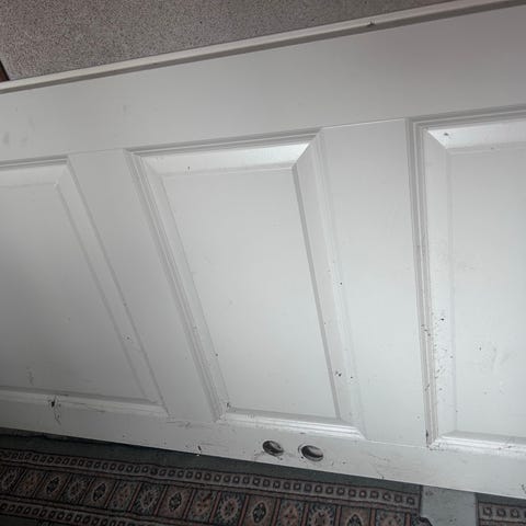 Valkoiseksi maalattua puuta, perusovi sisätiloihin. Karmin mitat 89,5 x 209cm. Nouto Järvensivusta.