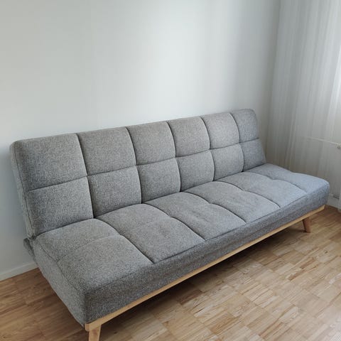 Myydään edullisesti vuodesohva (kuvassa etualalla) tilanpuutteen vuoksi. Selkänojan saa kaadettua vuodesohvaksi. Käsinojat on irroitettavissa. Levitettynä 175*100cm.
