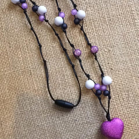 Puuhelmistä ja kimalle/ villalangalla päälystetyistä puuhelmistä tehty
