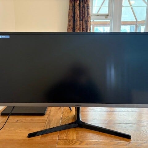 Samsung S34j55x näyttö, 34 tuuman ultrawide-malli mustalla rungolla. Näytössä on leveä kuvasuhde, joka soveltuu moniajoon ja laajojen työpöytänäkymien käyttöön. Liitännöissä HDMI-portit sekä DisplayPort. Sopii tietokoneen ulkoiseksi näytöksi toimisto- ja kotikäyttöön.