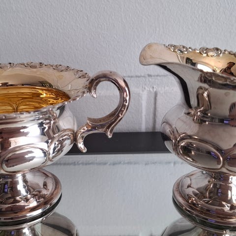 Hopeoitu sokerikko kannella ja kahvoilla. Astia on metallia ja siinä on kaksi korvakahvaa sekä neljä koristeellista jalkaa. Kansi on irrotettava ja siinä on nuppimainen kahva. Astian pinnassa on kaiverrettuja ja kohokuvioituja koristekuvioita, ja pohjassa on kaiverrus vieraalla kielellä. Paino kuvassa olevan vaa’an mukaan noin 280 g. Soveltuu esimerkiksi sokerikon tai pienen tarjoiluastian käyttöön.