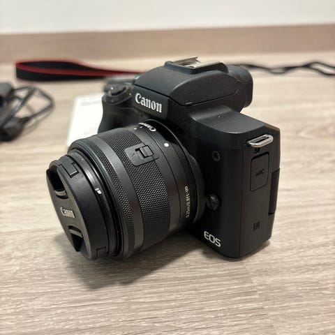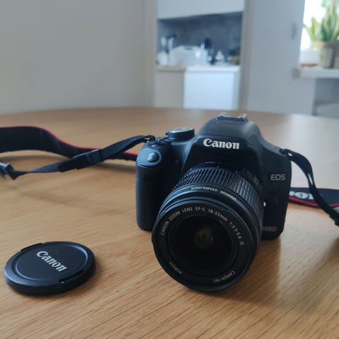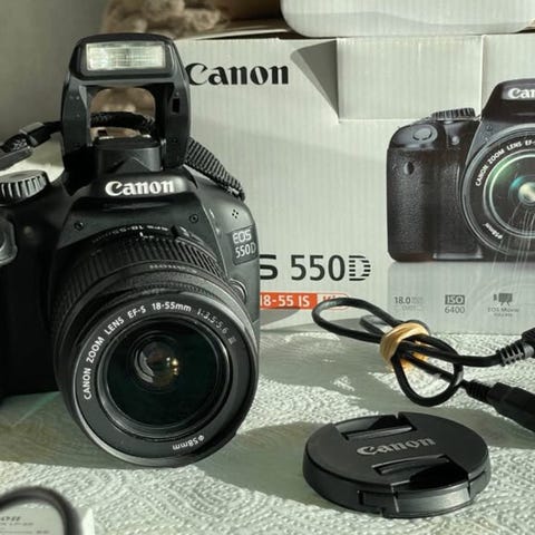 Canon EOS 500D -järjestelmäkamera, jossa mukana Canonin 18–55 mm zoom-objektiivi kuvanvakaimella (Image Stabilizer). Rungon väri on musta. Kamerassa on vaihdettavat objektiivit, käsisäätömahdollisuudet ja yleinen jalustakierre rungon pohjassa. Sopii valokuvaukseen erilaisissa tilanteissa, kuten arki-, matkailu- ja maisemakuvaukseen sekä perusvideokuvaukseen. Objektiivin polttovälialue 18–55 mm kattaa laajakulmasta normaaliin kuvakulmaan. Kamerassa on Canon EOS -hihna kaulakäyttöä varten.